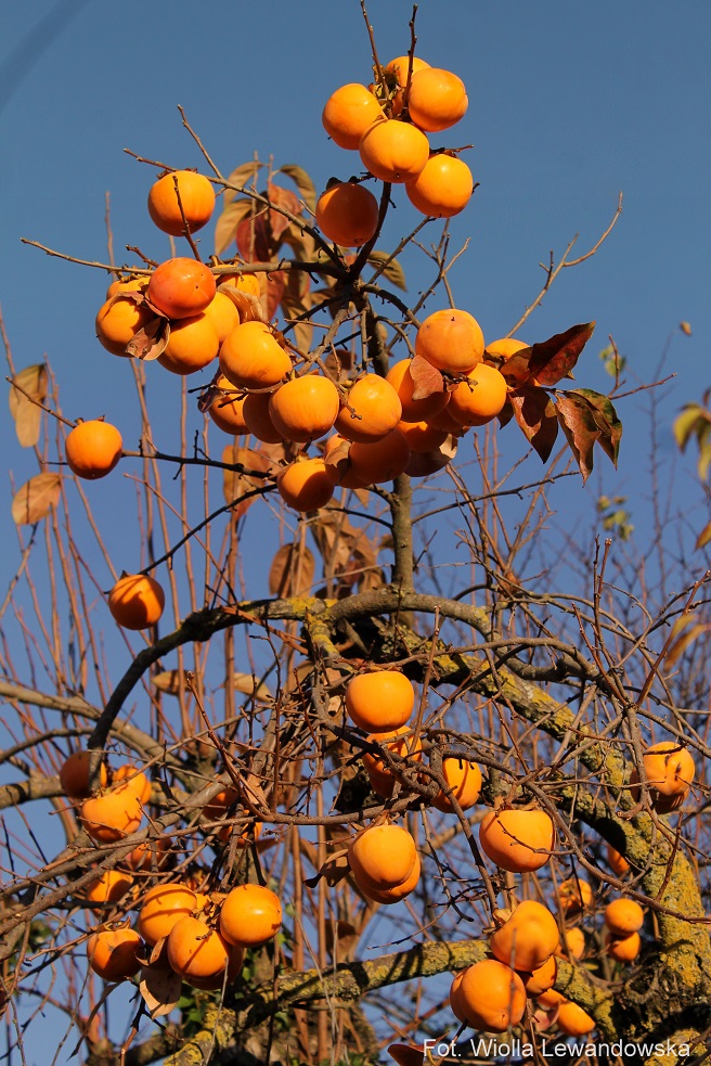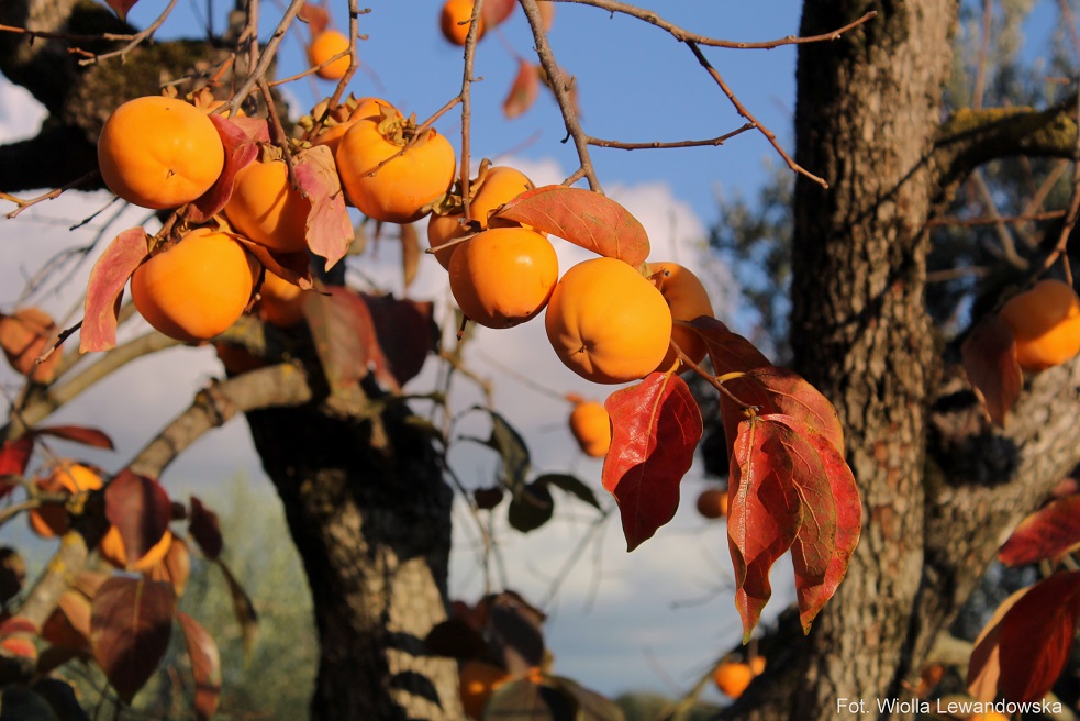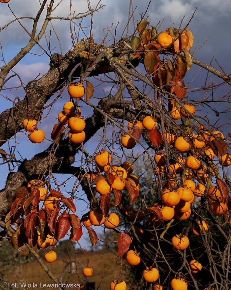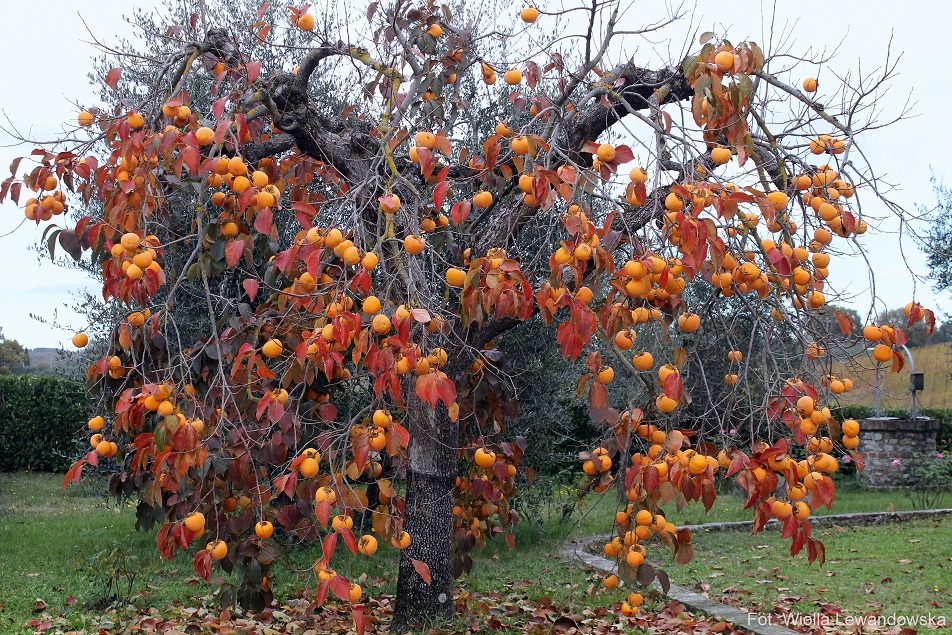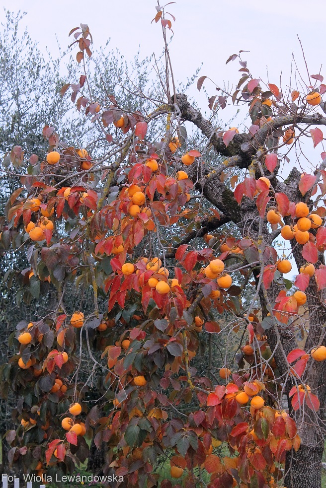 “Hurma, hebanek, hebanowiec, kaki, sharon, szaron, szarona, persymona (Diospyros L.) – rodzaj roślin drzewiastych z rodziny hebankowatych. Występują one w strefie międzyzwrotnikowej, głównie w Azji (zwłaszcza w południowych Chinach) i na obu kontynentach amerykańskich o klimacie tropikalnym i subtropikalnym.” – cytuję z Wikipedii. Napisano tam jeszcze, że istnieje ich kilkaset gatunków, z czego tylko kilka odmian jest jadalnych. Na szczęście owoce drzew, które mnie zachwyciły Diospyros Kaki są jadalne. We włoskiej wersji Wikipedii dodatkowo napisane jest, że Dios Pyros to w jęz. greckim Owoce Bogów. Dobrze wiedzieć 🙂