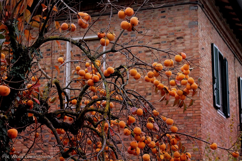 Szcególnie miło wspominam listopadowe słoneczne popoludnia, które przerodziły się w mój zachwyt nad drzewkami obficie obwieszonymi owocami, które tu w Toskanii miejscowi nazywają “pommi” ale oficjalnie znane są też jako “cachi” albo “kaki”. W pisowni języka włoskiego rzadko spotyka się literę “k” (najczęściej w nowoczesnym, młodzieżowym slangu) i taka pisownia tego słowa została przejęta z języka japońskiego. W Italii określa się ten owoc jako “jabłko Dalekiego Wschodu”, skąd pochodzi to piękne i użyteczne drzewo. W polskiej wersji Wikipedi drzewo to nazywane jest Hurma.